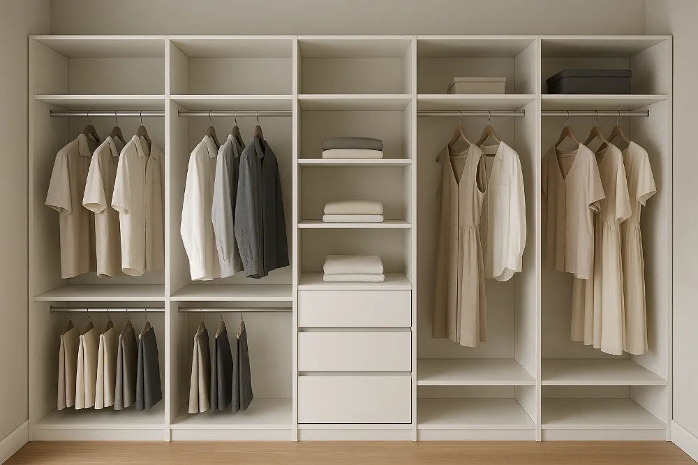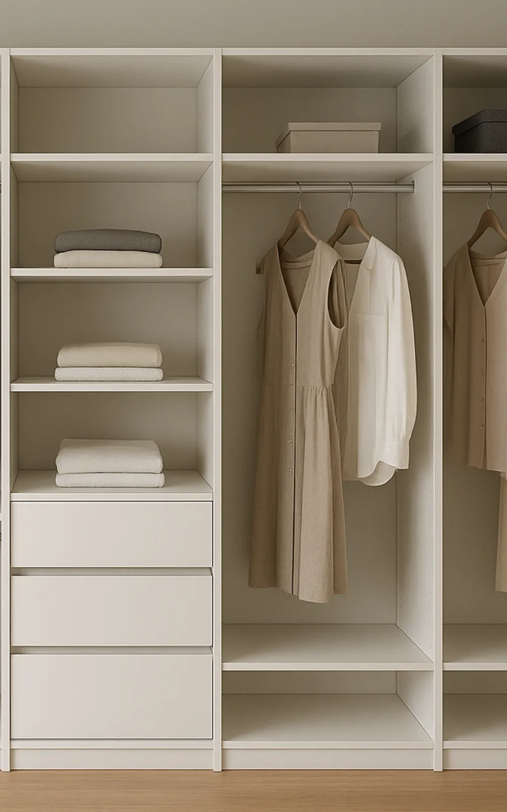 Convierte tu vestidor en un espacio funcional y elegante con nuestro closet modular a la medida. Diseñado en módulos individuales en color blanco y con forros, sin frentes que aportan un acabado limpio y uniforme, este modelo incluye un módulo con 3 cajones cada 2 metros lineales para mantener tu ropa y accesorios siempre organizados. Su estilo abierto y moderno es perfecto para quienes buscan practicidad sin perder sofisticación.